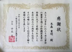 2021年8月8日 / 最終更新日 : 2021年8月8日 yone ブログ 日本分析機器工業会から感謝状 「分析機器の手引き」2019、2020年版の改訂・編集に携わったことから、日本分析機器工業会(JAIMA)の設立60周年記念式典(半年遅れで開催)にて感謝状をいただきました。現在は英語編を作成中です。